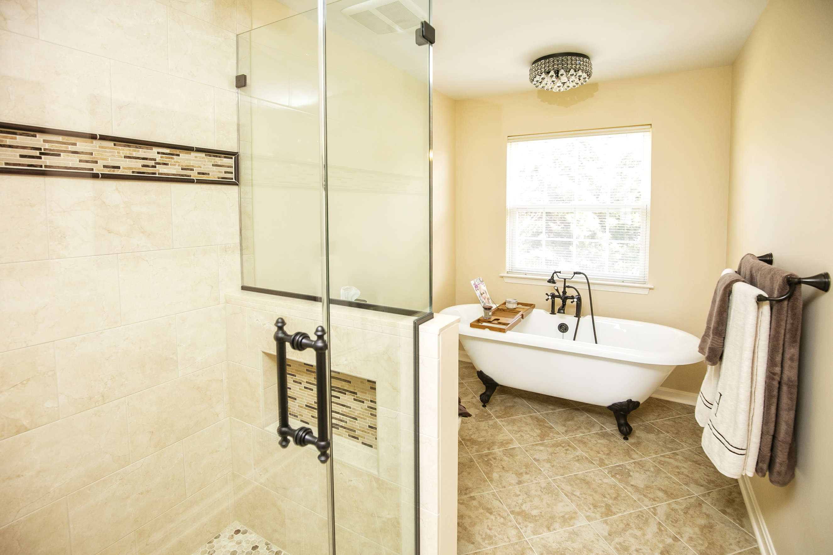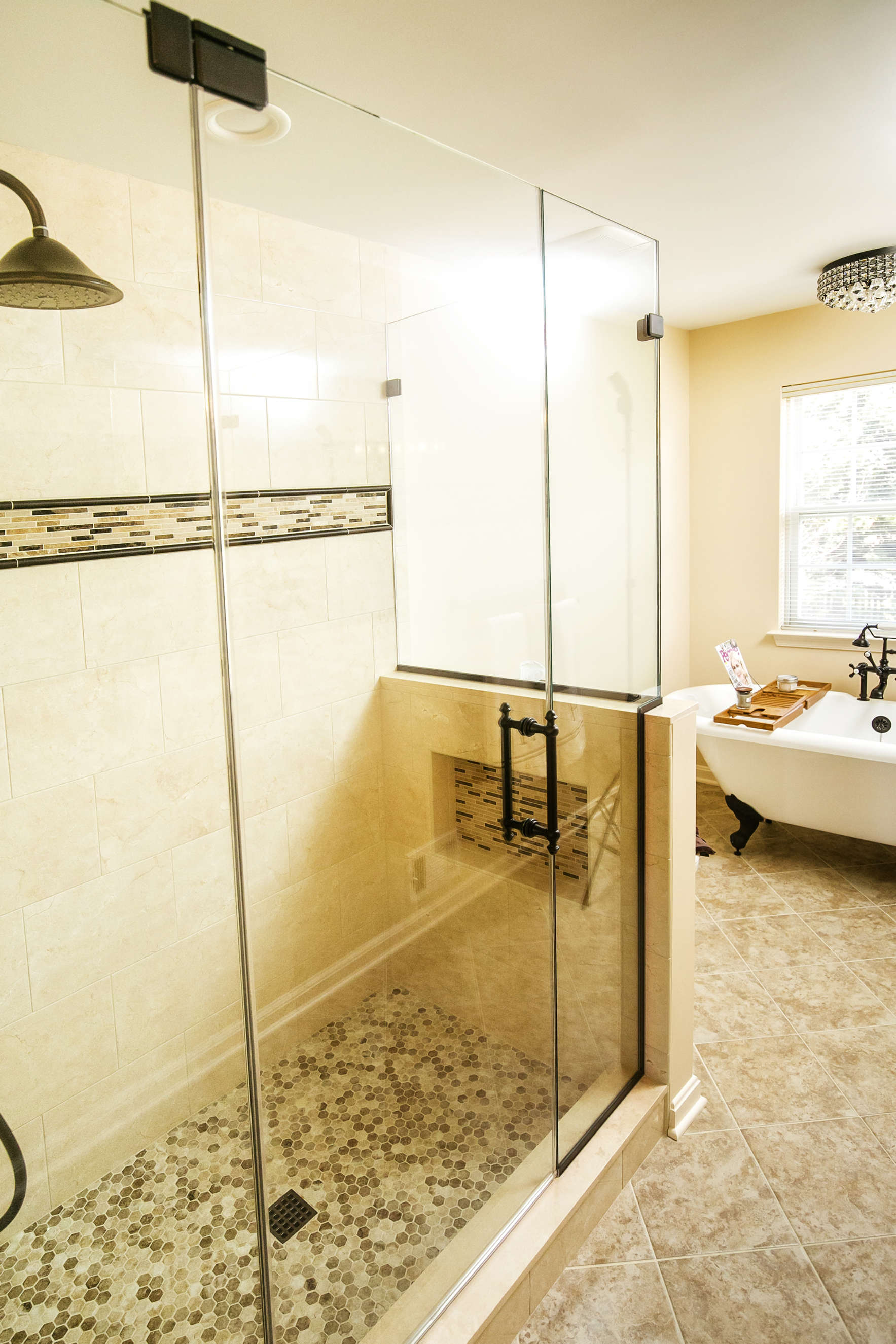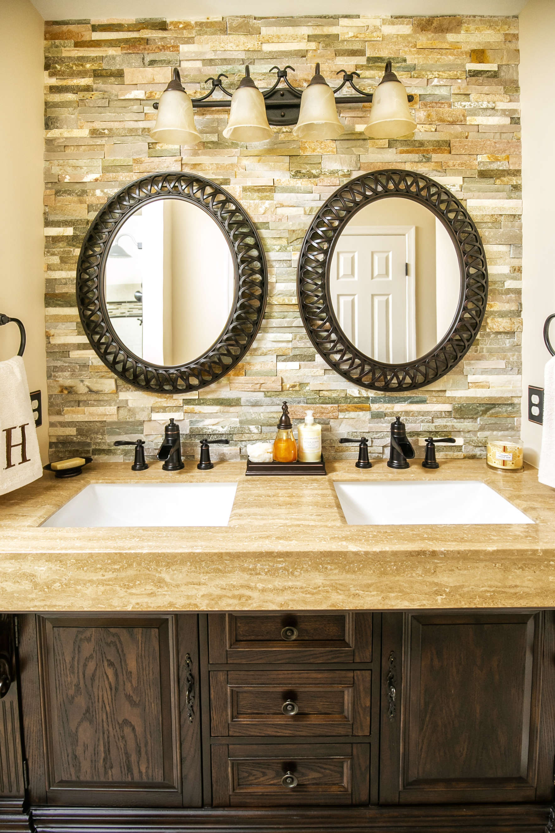 A beautiful blend of traditional and transitional elements combine to create this luxurious ensuite. Entering through the custom barn doors immediately reveals the specialties of the room. The double sink bowl vanity is a replica of turn of the century cabinetry, featuring water pump style faucets in oil rubbed bronze. Its uniqueness is enhanced by the ledger stone accent wall. Replacing the original garden tub with a lion paw footed stand alone model acts as the focal point of the bath, and the hand held cradle tub faucet completes the look. The shower keeps the style perfectly, with hexagon floor tile and Venetian bronzed fixtures adding interesting contrast to the updated desert cream Emser tile. The result is a perfect oasis offering modern elements, while still paying reverence to days gone by.