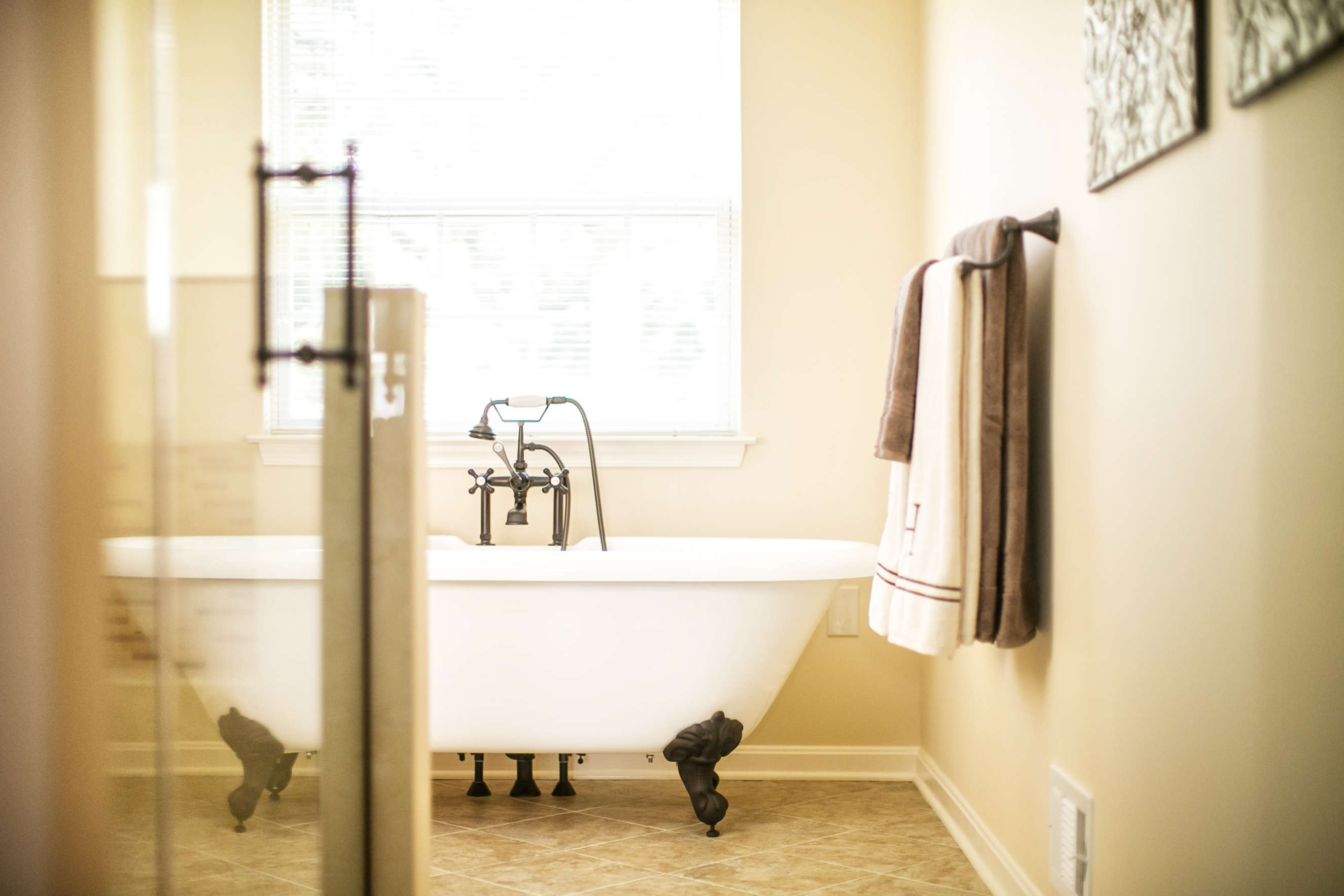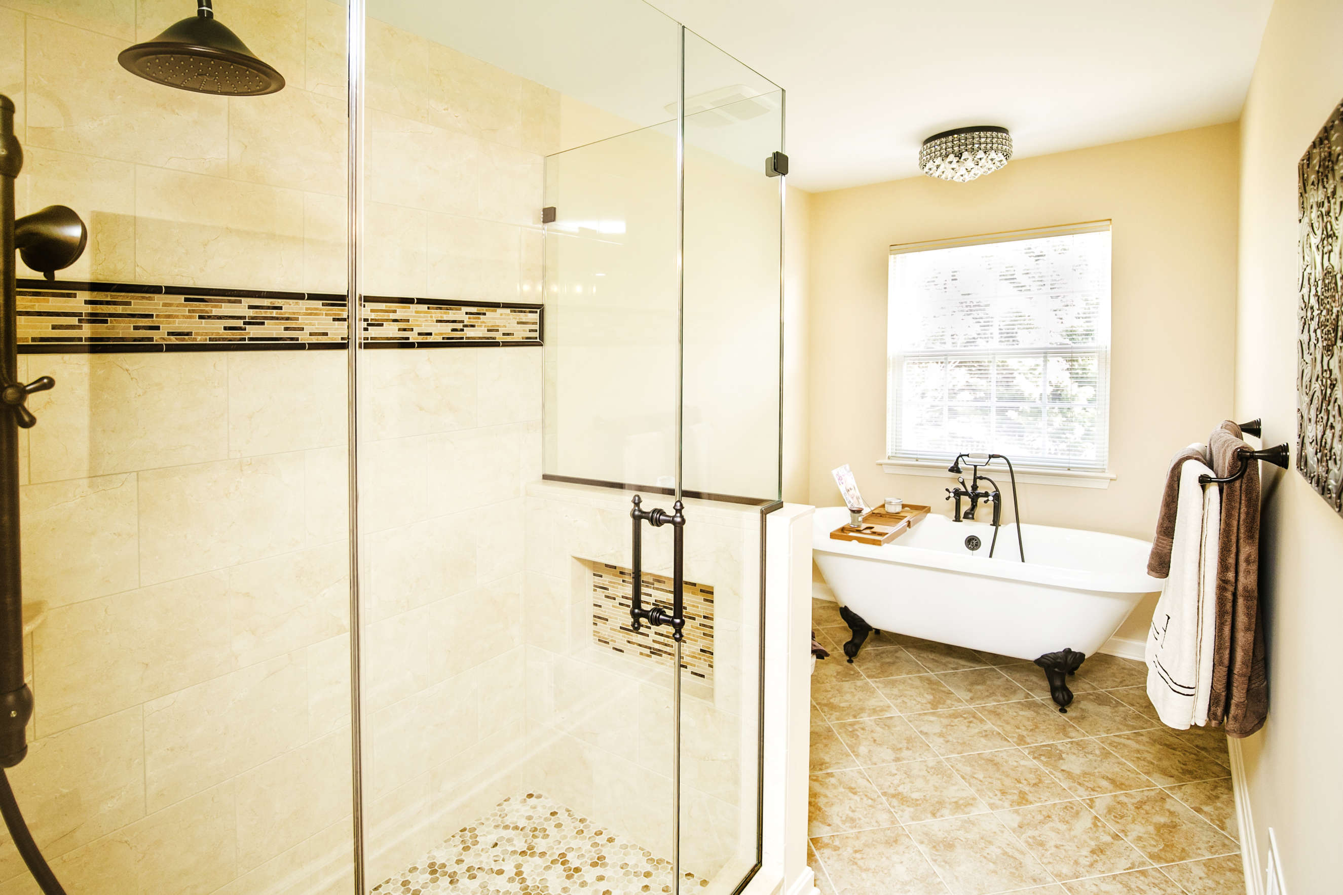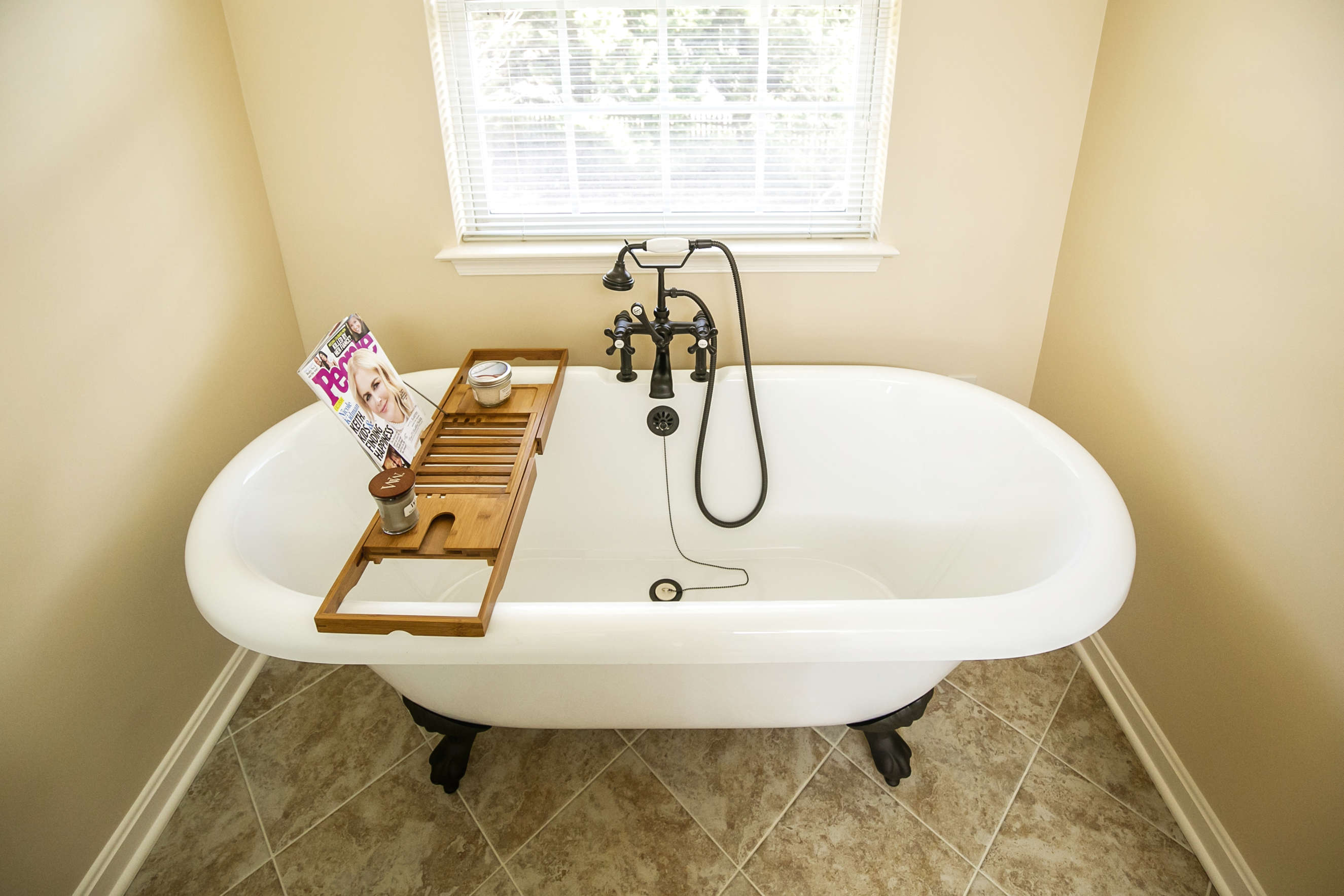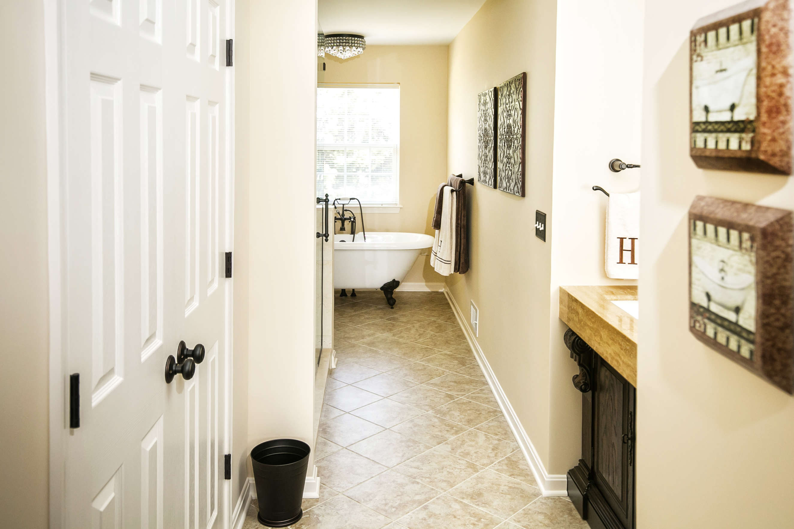 A beautiful blend of traditional and transitional elements combine to create this luxurious ensuite. Entering through the custom barn doors immediately reveals the specialties of the room. The double sink bowl vanity is a replica of turn of the century cabinetry, featuring water pump style faucets in oil rubbed bronze. Its uniqueness is enhanced by the ledger stone accent wall. Replacing the original garden tub with a lion paw footed stand alone model acts as the focal point of the bath, and the hand held cradle tub faucet completes the look. The shower keeps the style perfectly, with hexagon floor tile and Venetian bronzed fixtures adding interesting contrast to the updated desert cream Emser tile. The result is a perfect oasis offering modern elements, while still paying reverence to days gone by.
