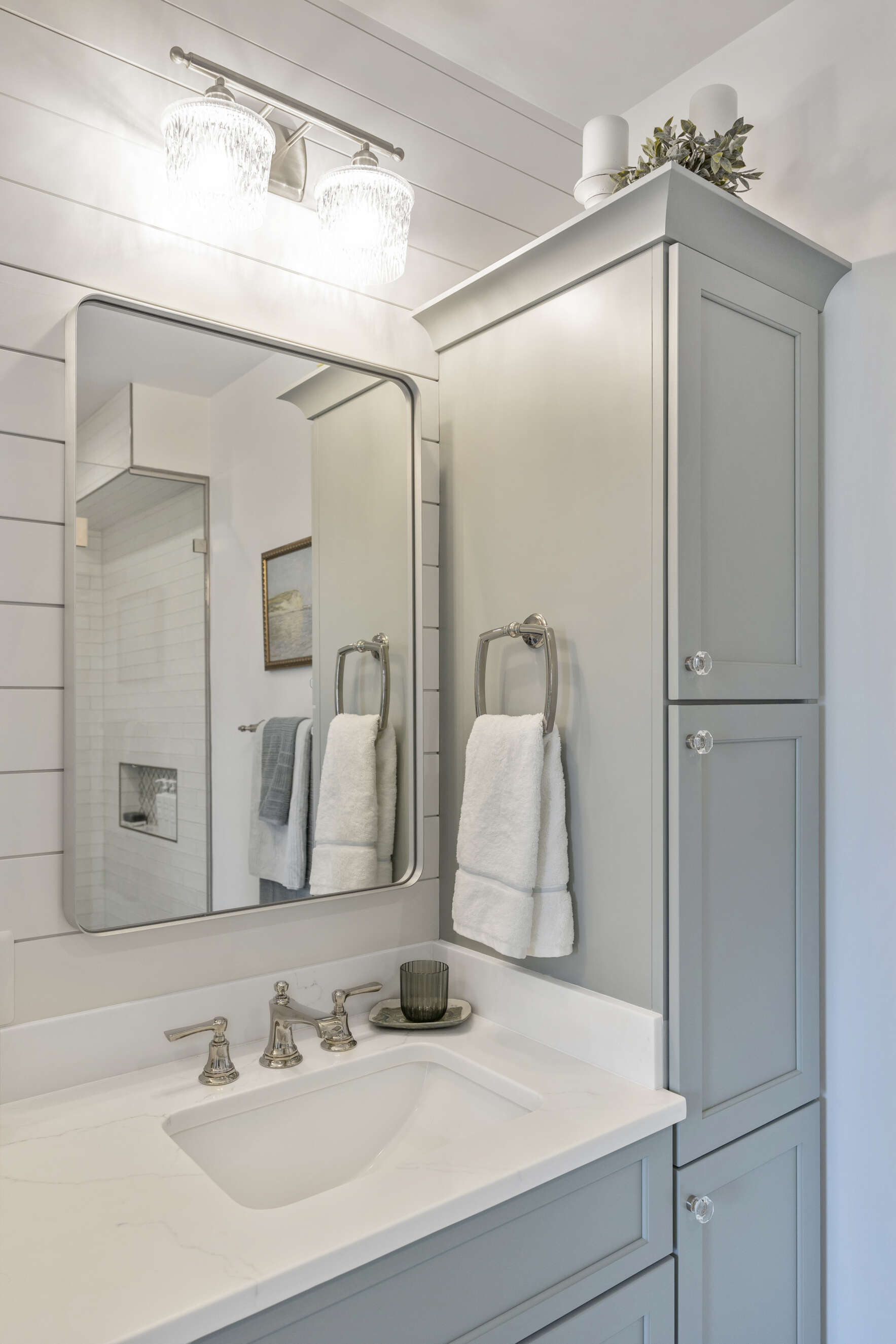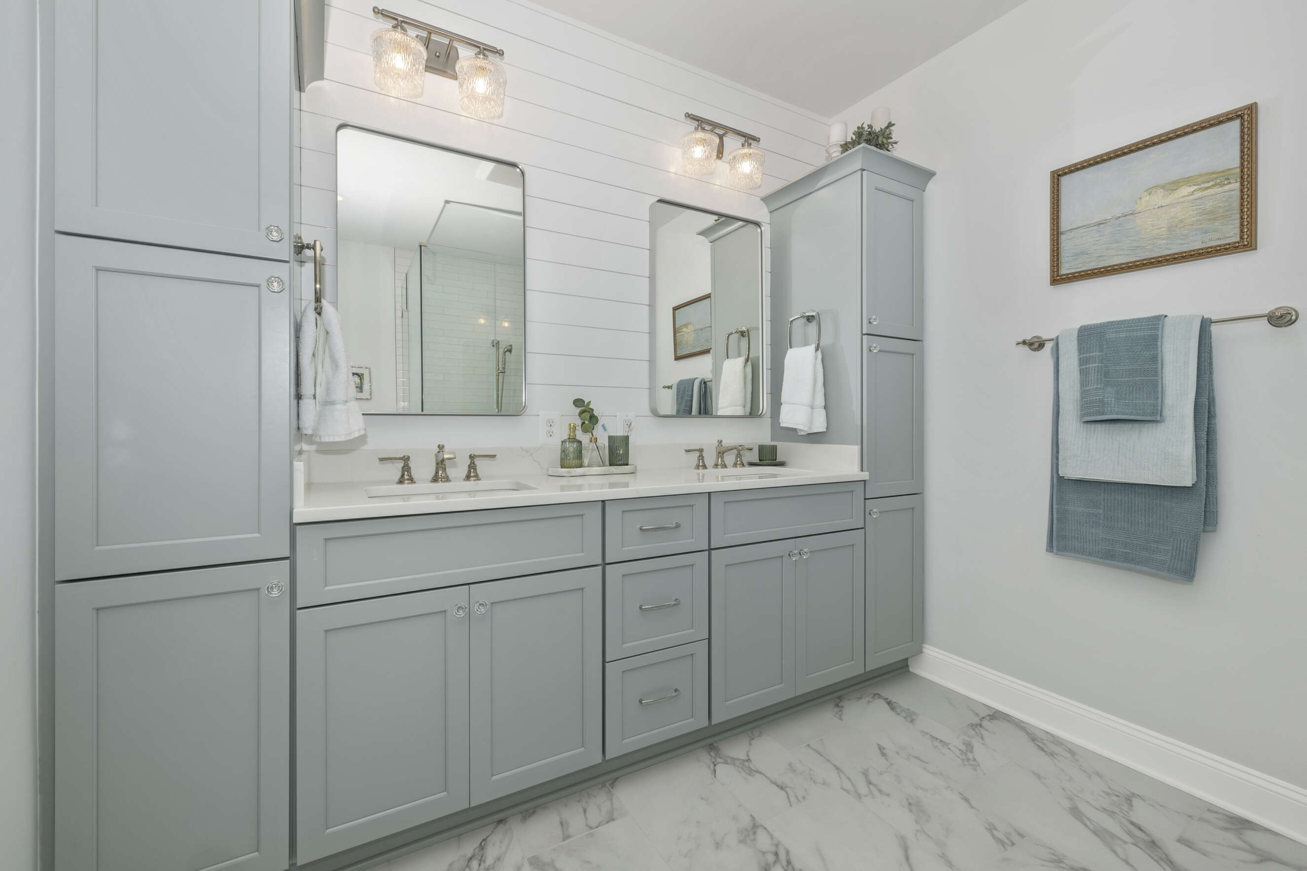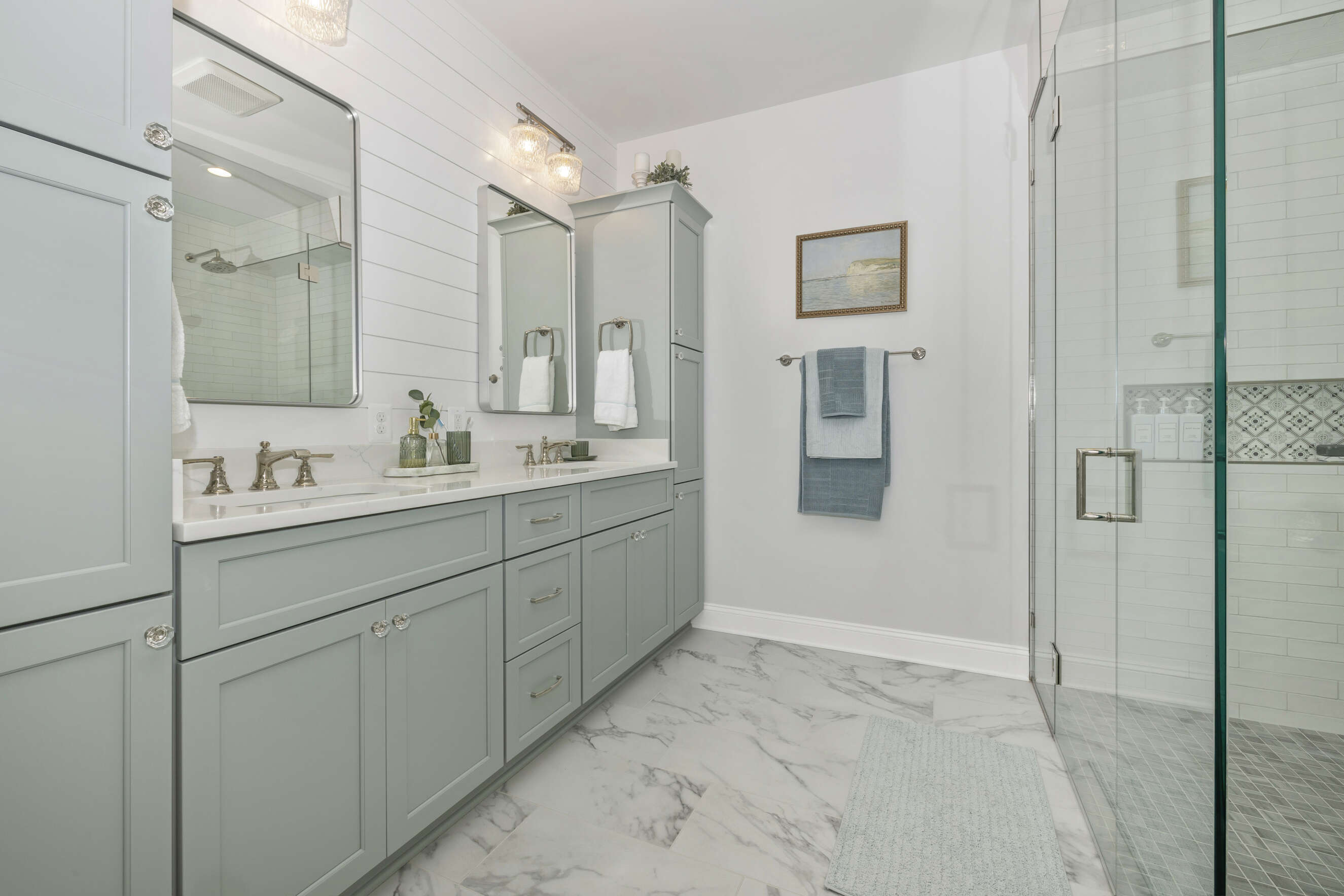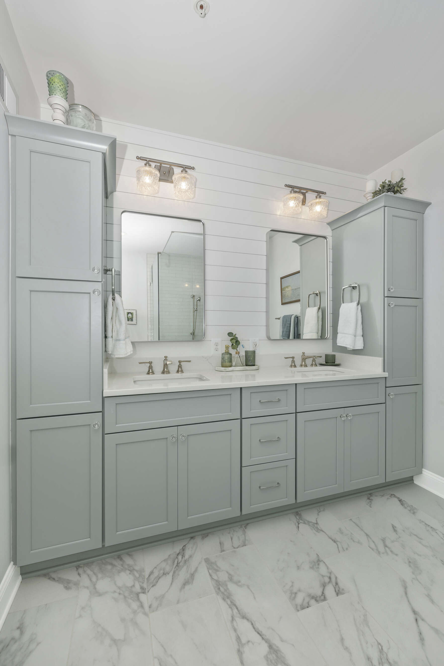 Absolutely stunning primary bath featuring a spacious shower, curbless entry, charming shiplap accents, and dual linen towers. The culmination of the owner's impeccable taste yields a rejuvenating and contemporary aesthetic! Beautiful! Thank you to our wonderful clients!!