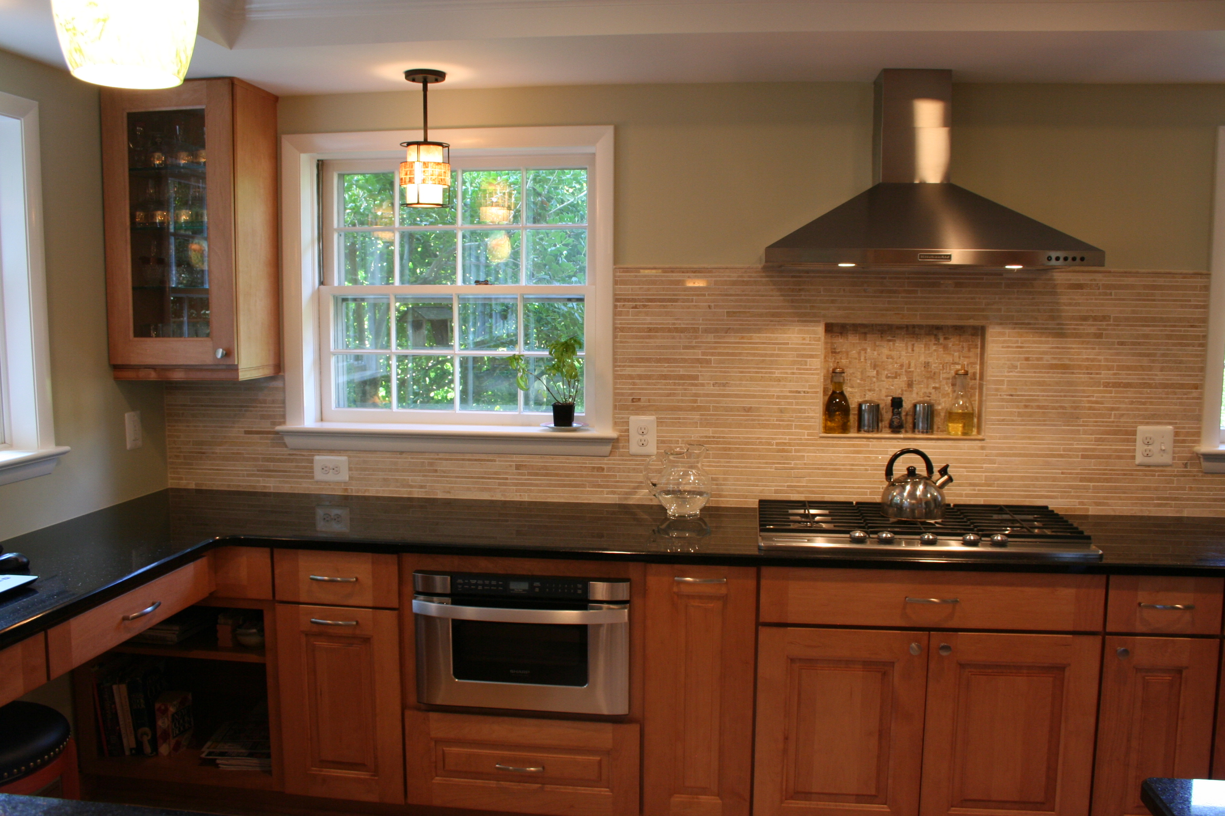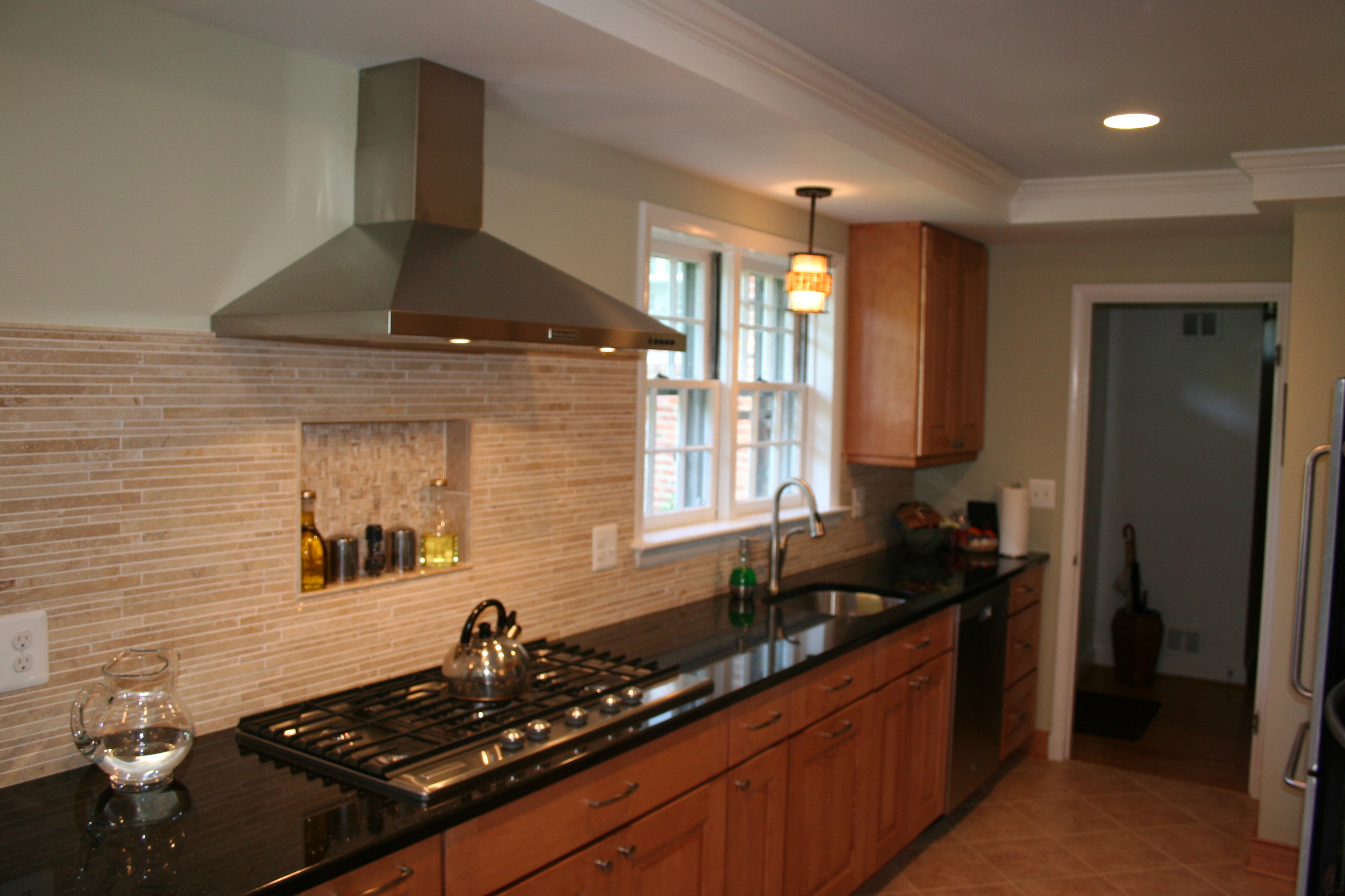 From drab to dramatic, this kitchen remodel transforms the home’s entire first floor. No longer a galley kitchen tucked away from the living space, the remodel reintroduces the kitchen as the family’s focal point. updated design elements include pendant and undercabinet lighting, oversized windows, tray ceiling, glass wall tile, recessed shelving, and gourmet appliances. sleek changes in lighting and color add to the blueprint, and Ultimately offer renewed style and sophistication to the home.