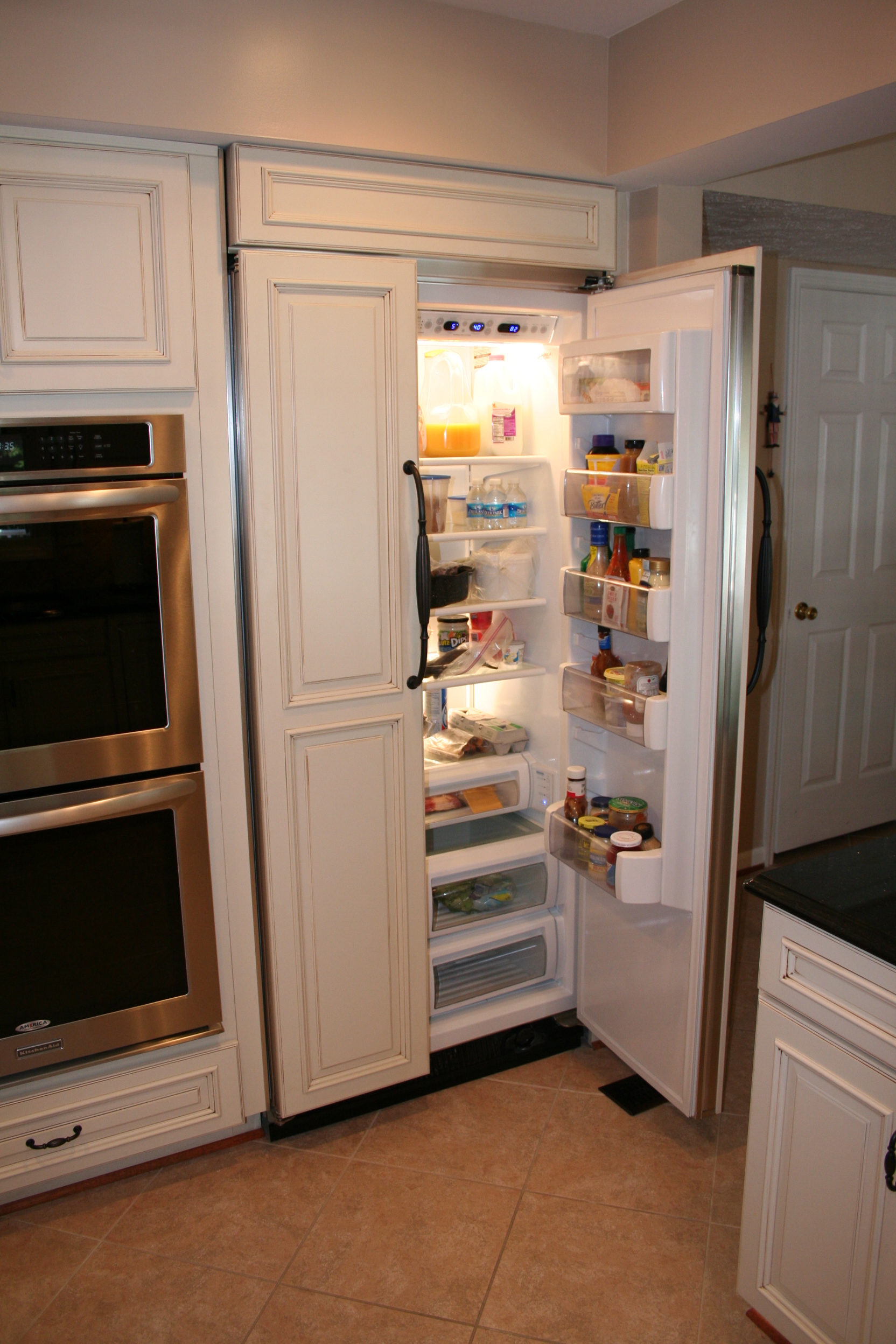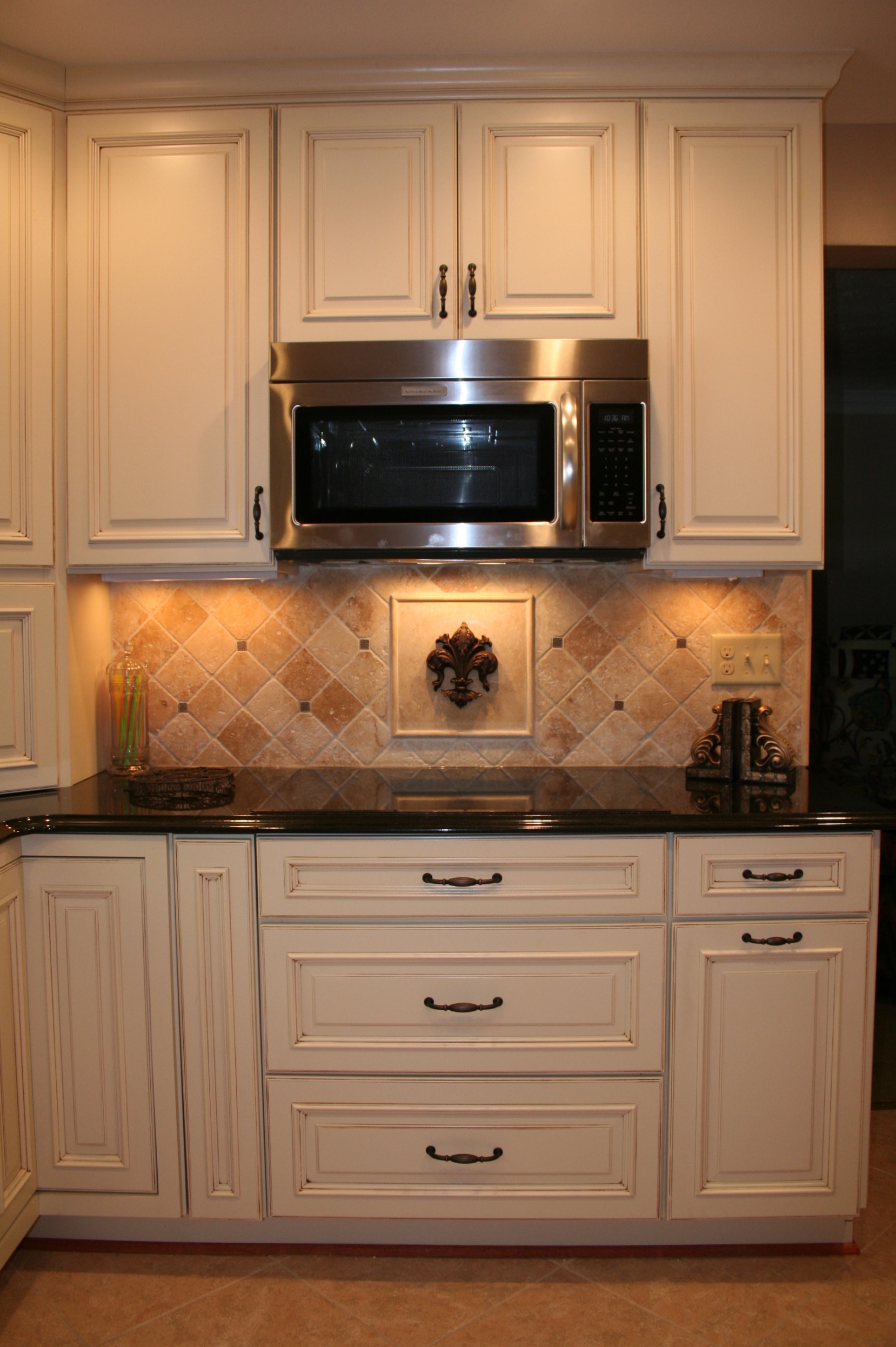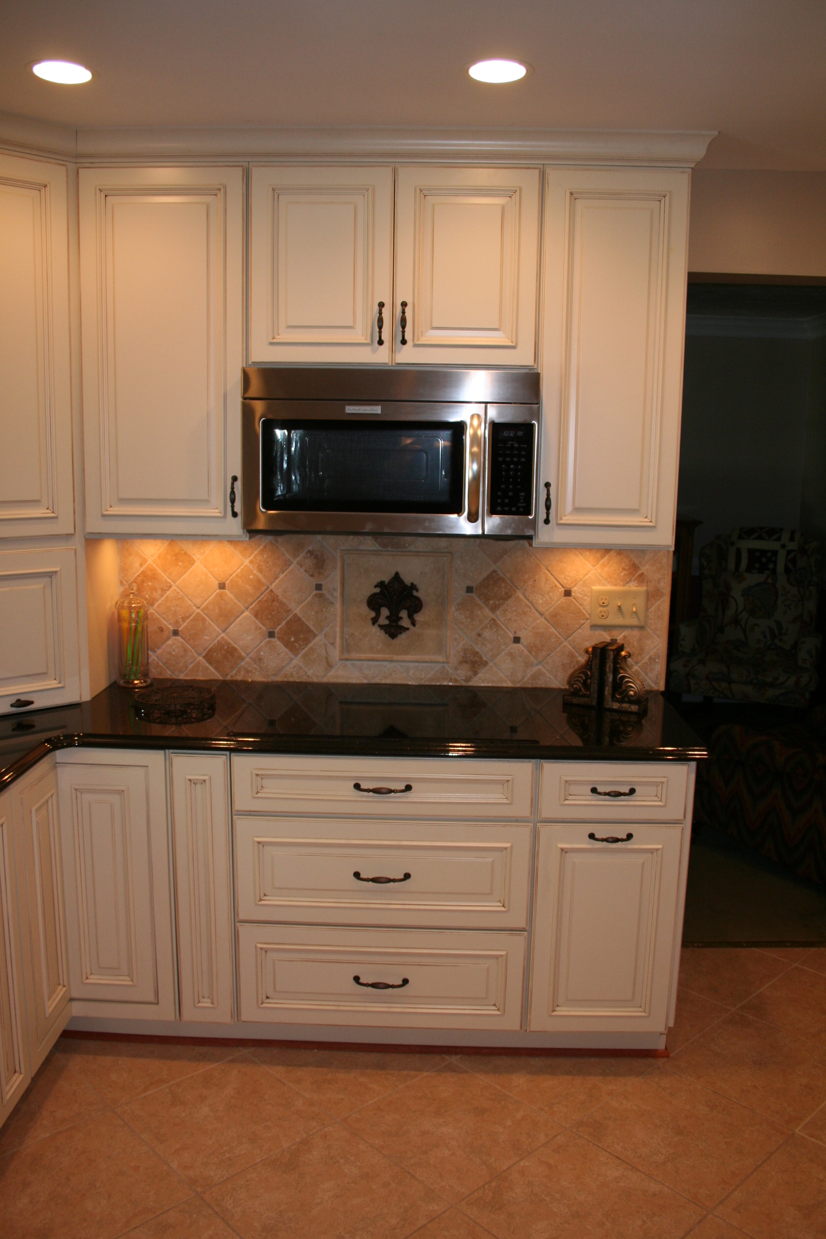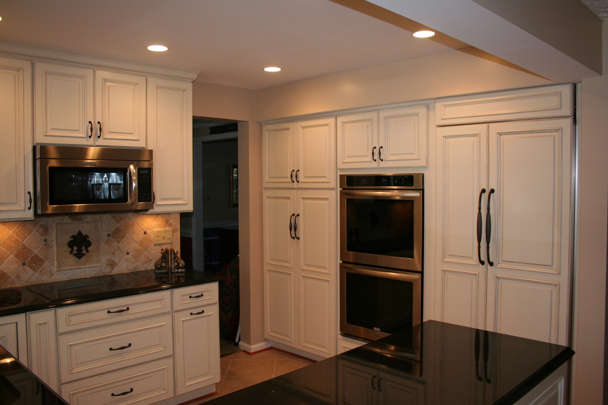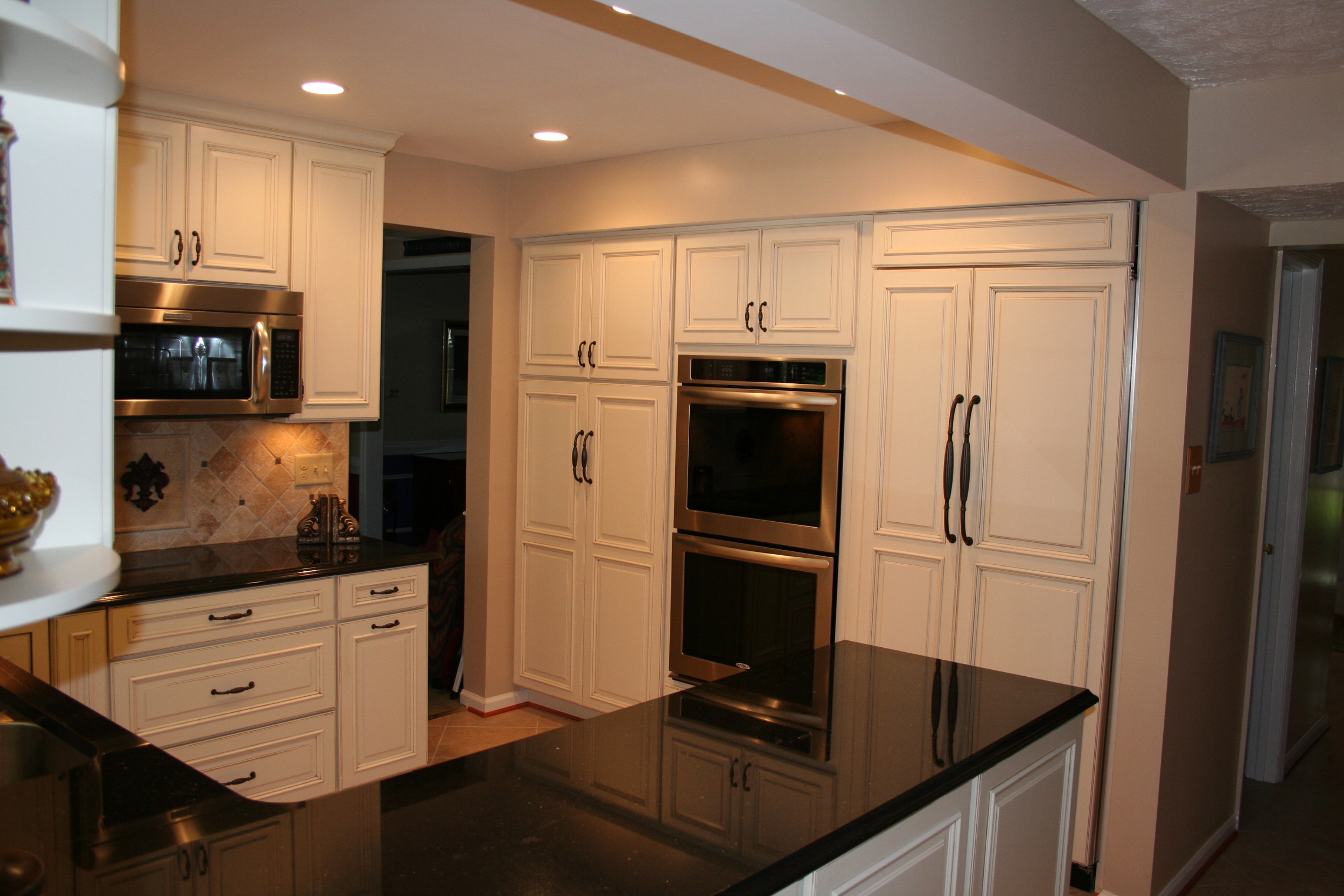 The creamy elegance of dove cabinetry contrasted against the warm elegance of black granite combine to create this spectacular kitchen's remodel. Undercabinet task lighting illuminate the tumbled tile backsplash. A full wall pantry cabinet provides storage, while the adjacent refrigerator panel finishes the symmetrical look. Fantastic clients to work with, too!