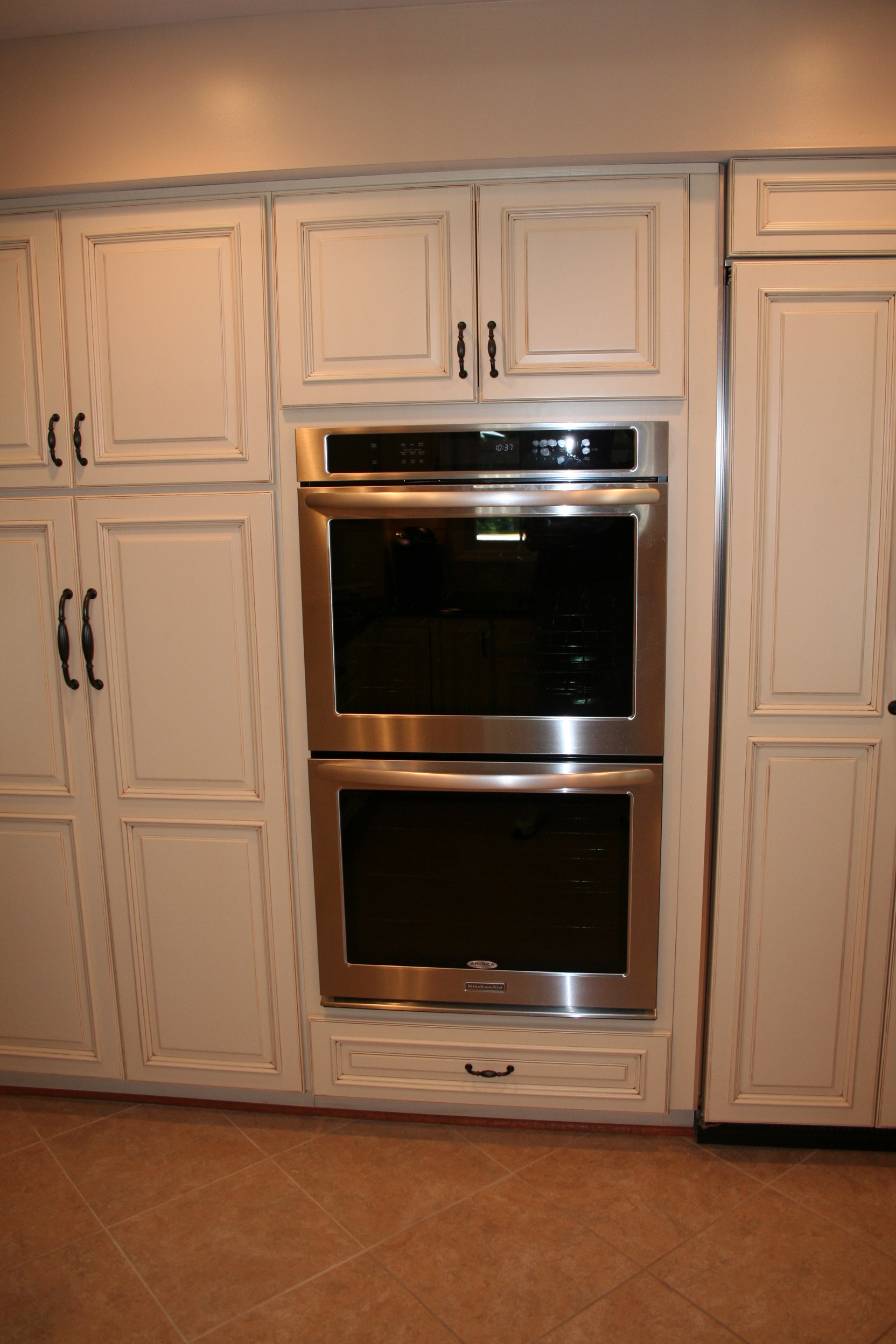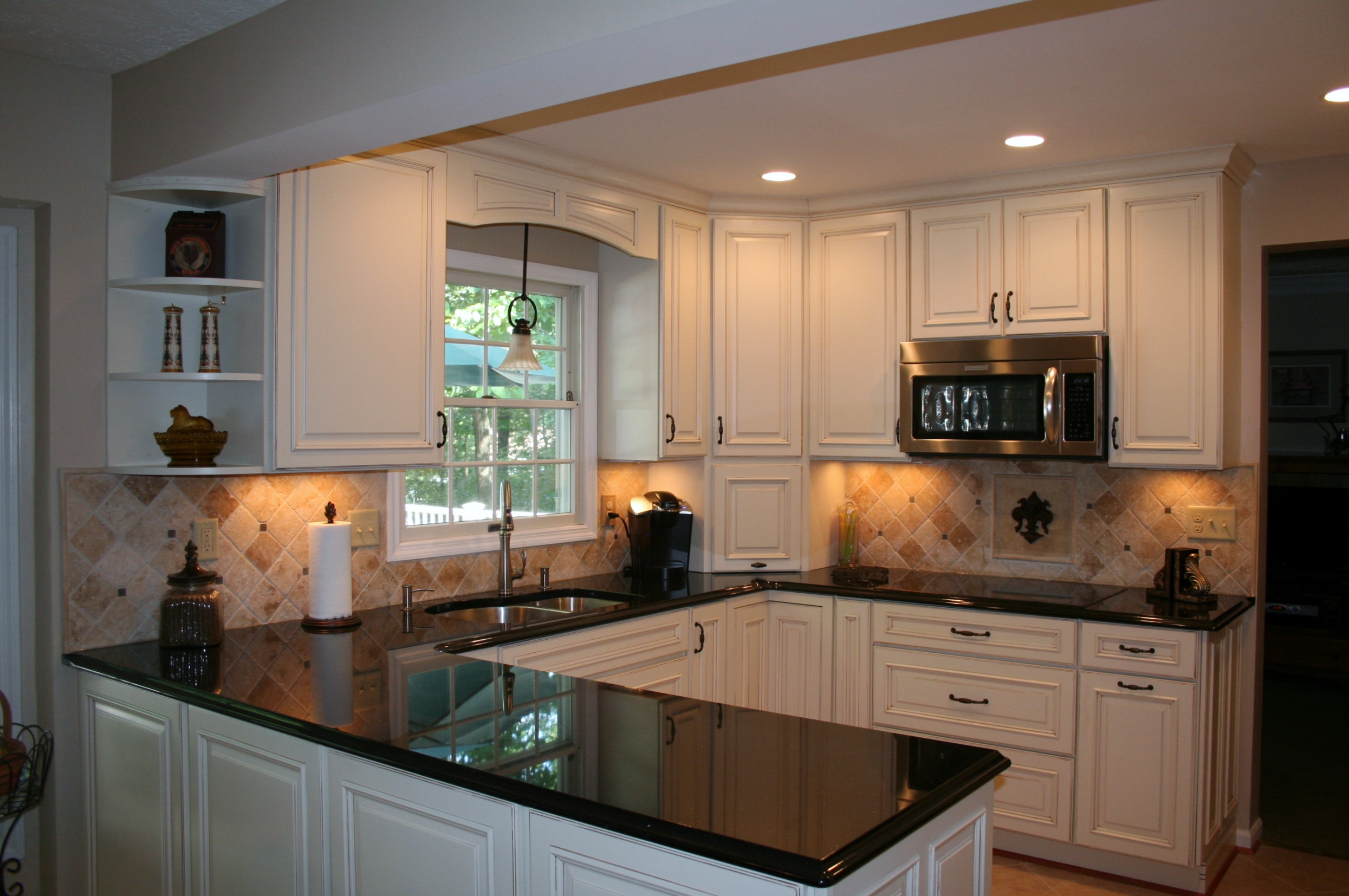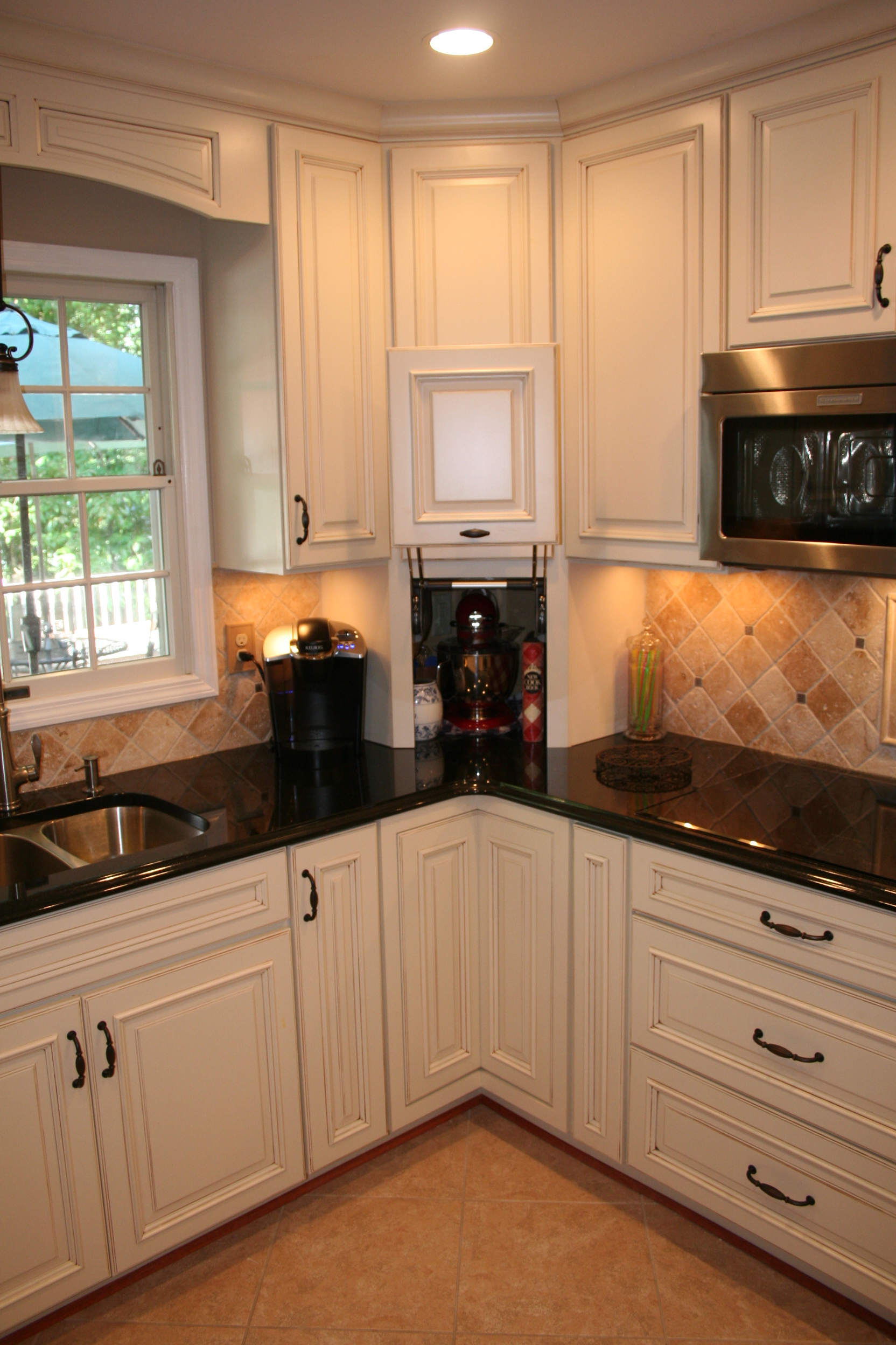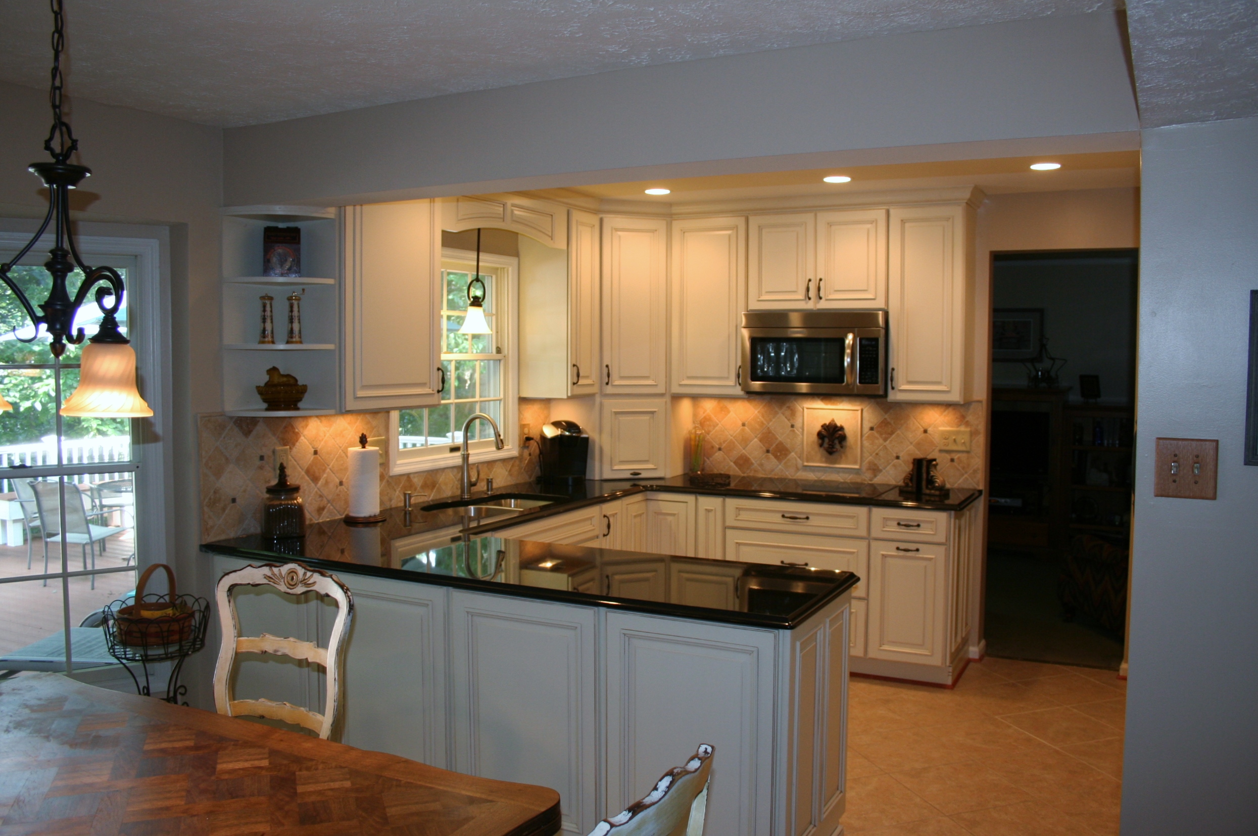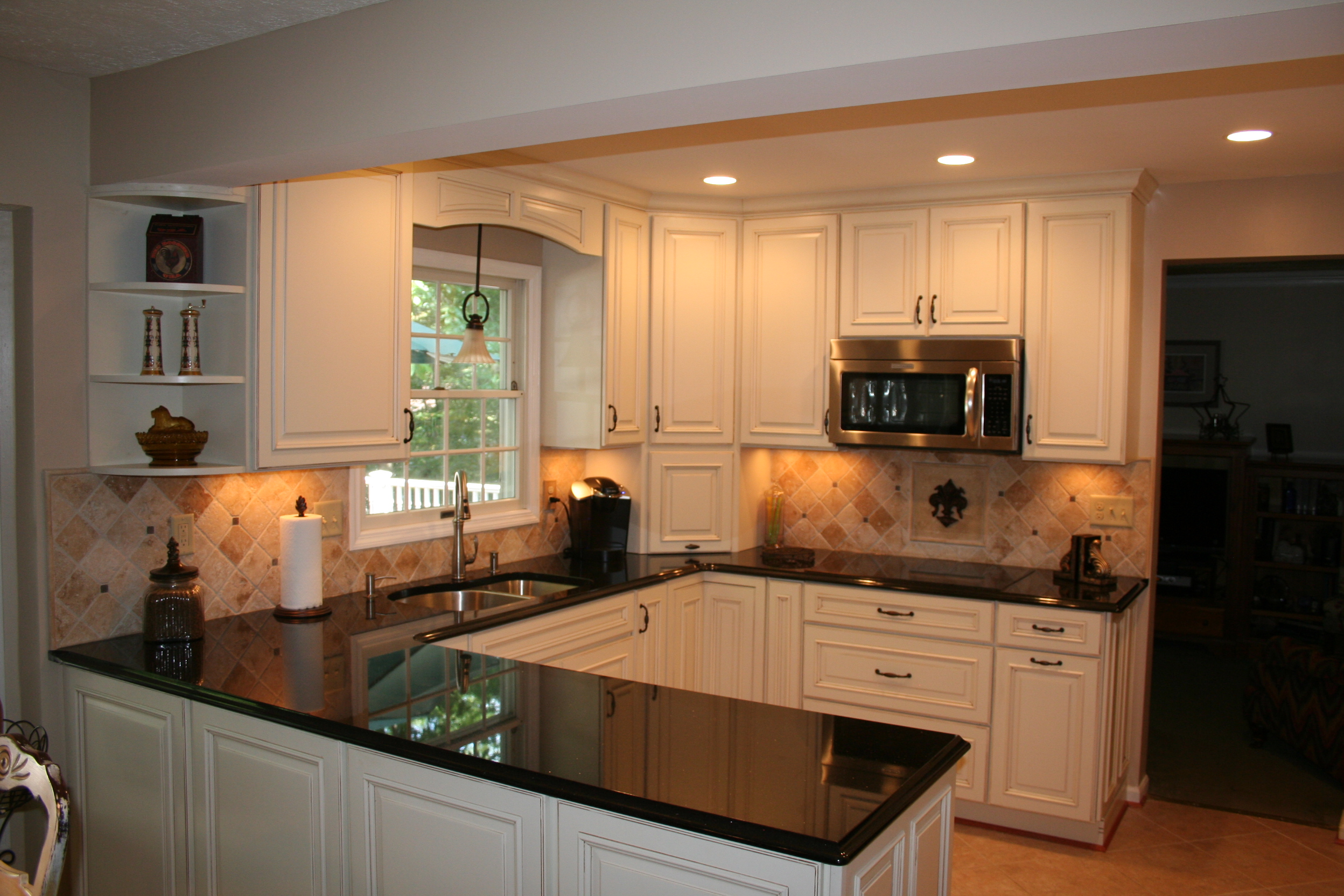 The creamy elegance of dove cabinetry contrasted against the warm elegance of black granite combine to create this spectacular kitchen's remodel. Undercabinet task lighting illuminate the tumbled tile backsplash. A full wall pantry cabinet provides storage, while the adjacent refrigerator panel finishes the symmetrical look. Fantastic clients to work with, too!