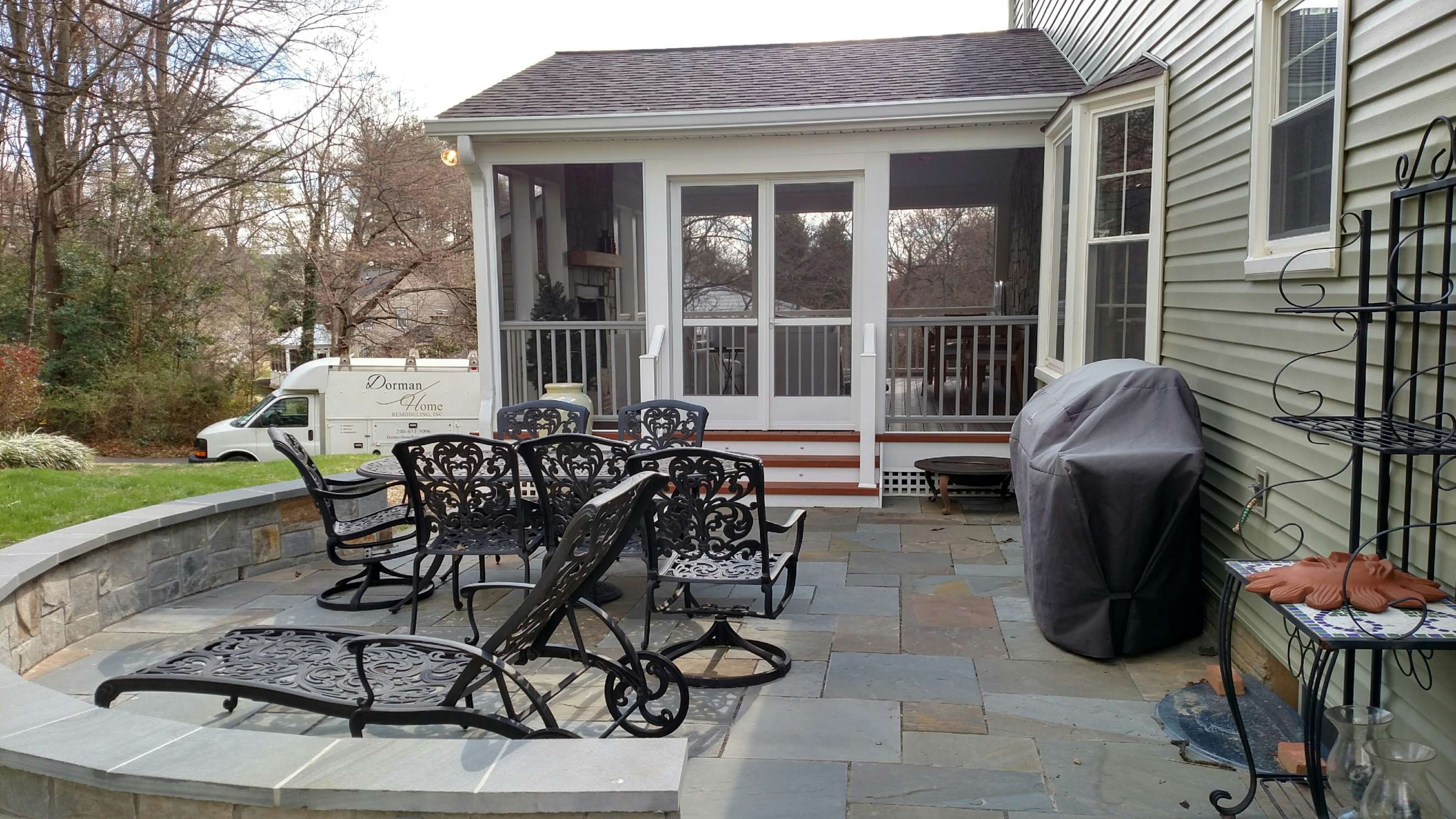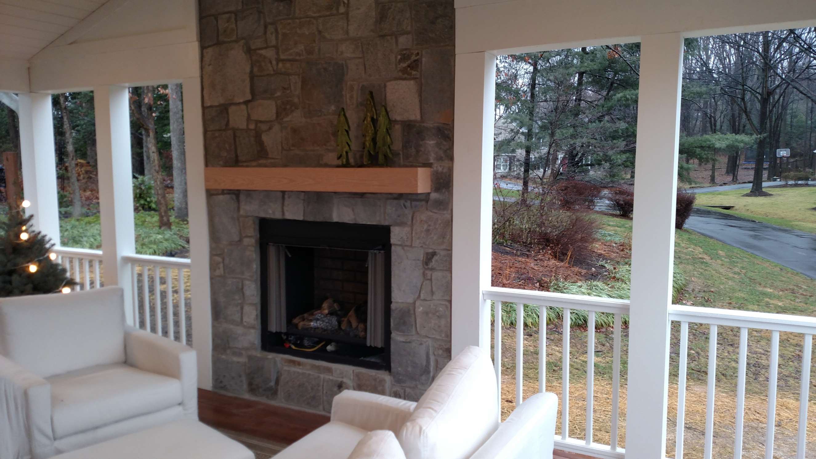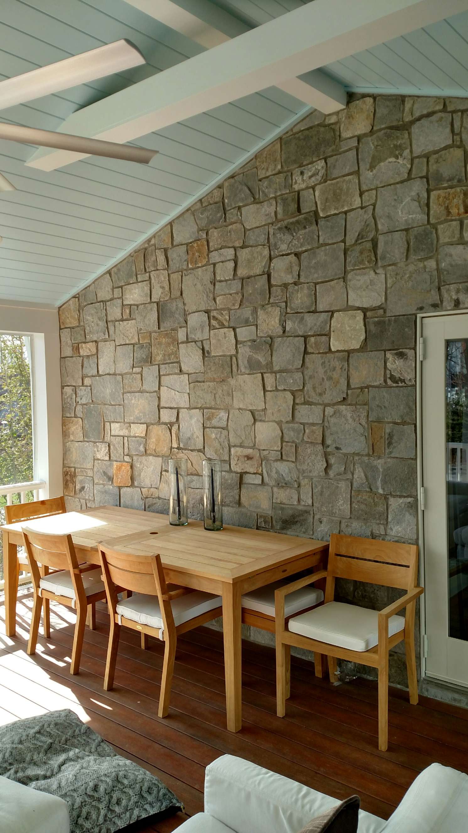 Is it possible to enjoy the warmth and comfort of inside living…..outdoors? This screen porch addition and patio proves it is! Complete with remote controlled fireplace, exposed beam ceiling, and double entry doors, this not-so-ordinary screened porch offers the homeowners the best of both worlds. Coyote grey ashlar stone adorns both the front and back walls, while the Zuri premium decking with a pecan finish adds warmth and style. The adjacent Pennsylvania flagstone patio is wrapped by a complementing knee wall which provides both estate-like aesthetics and a classically designed space.