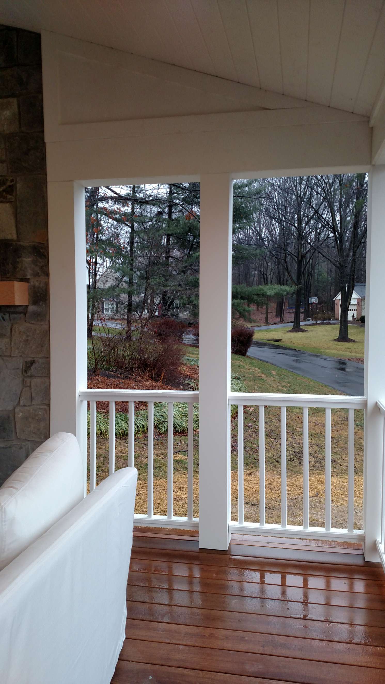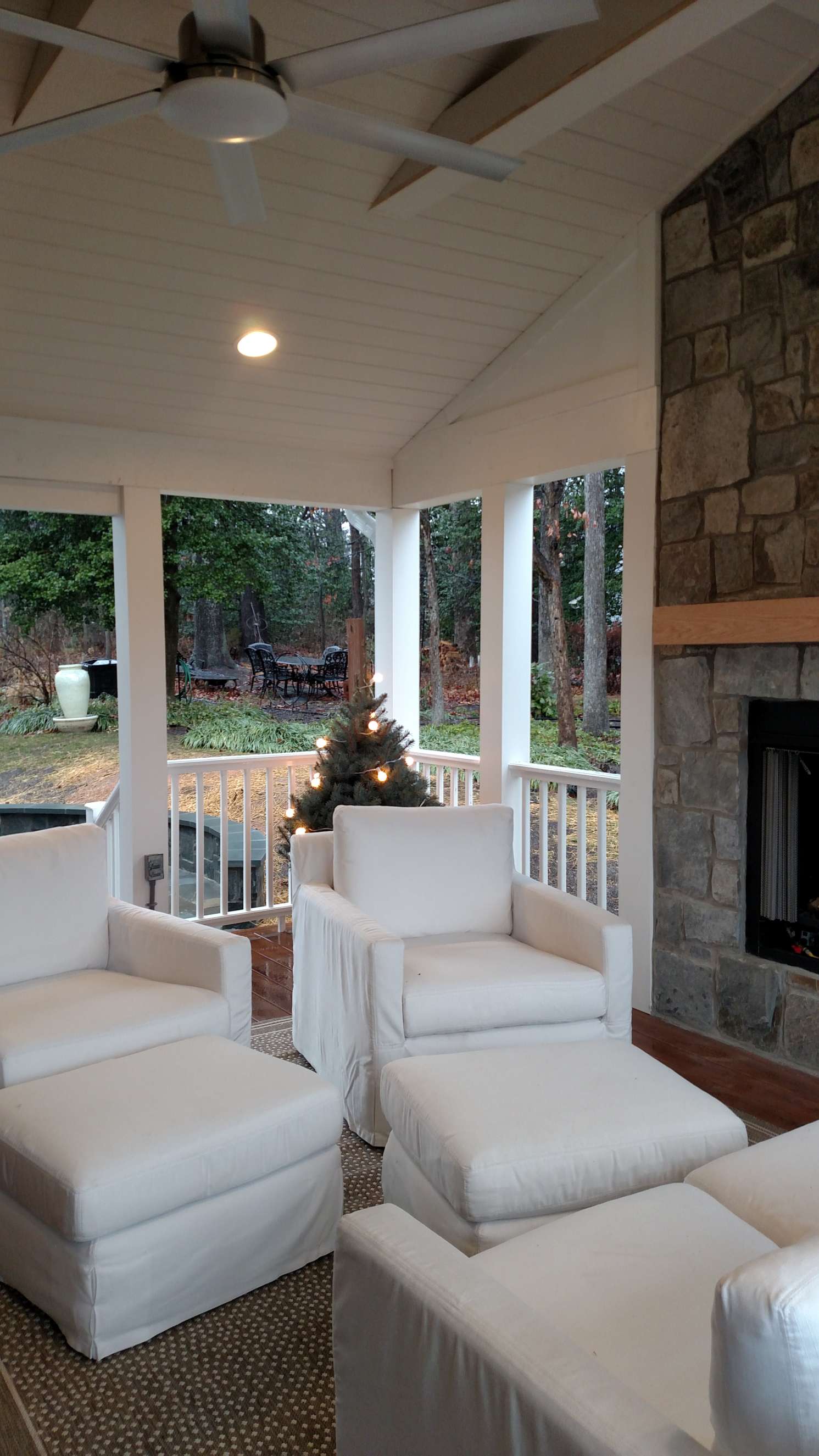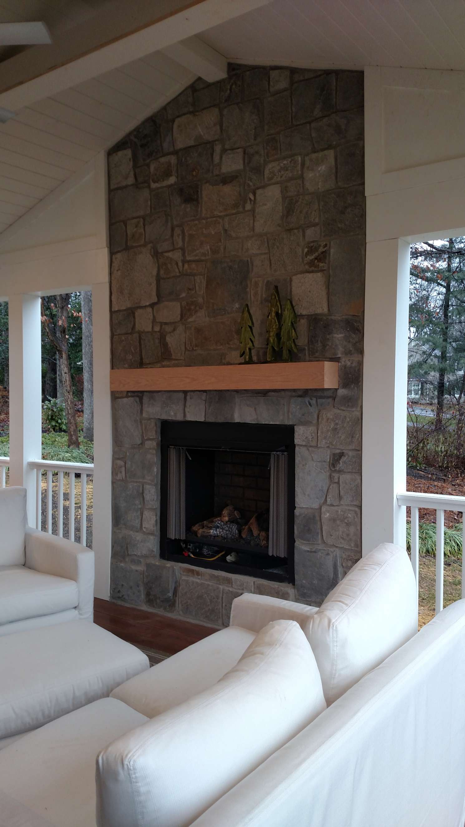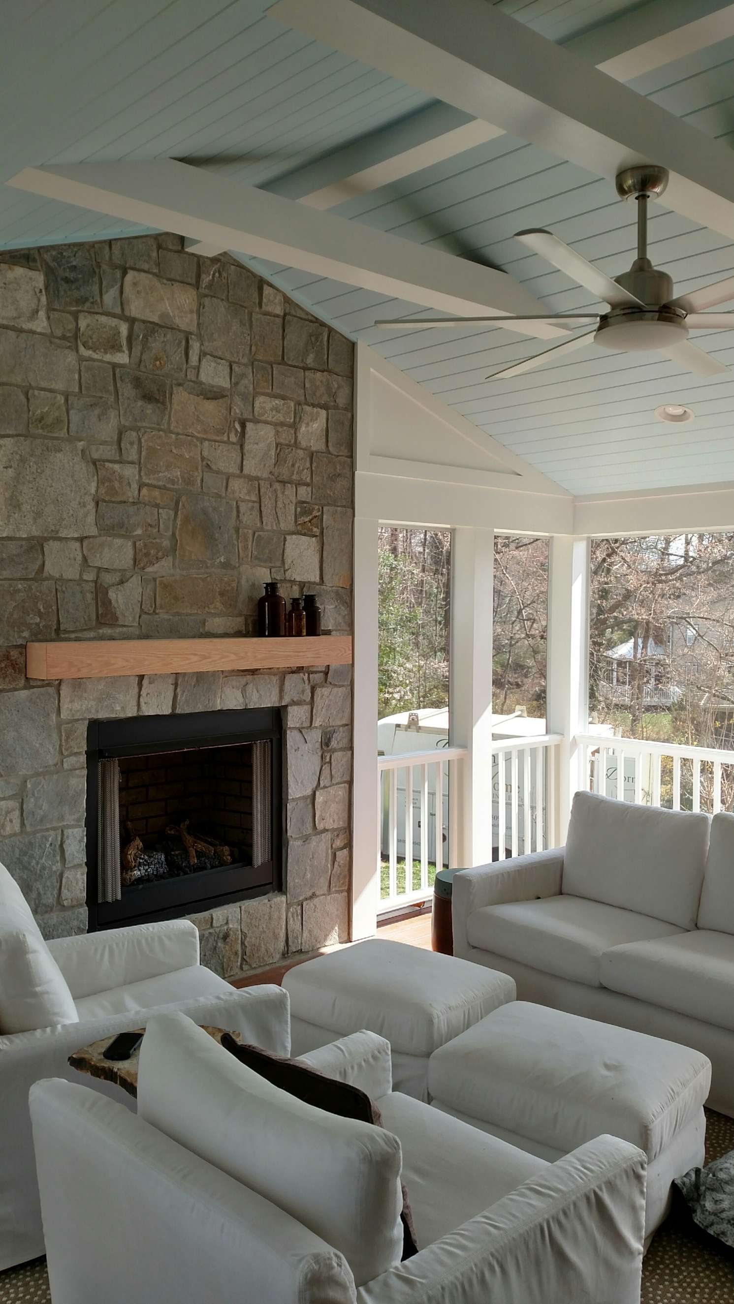 Is it possible to enjoy the warmth and comfort of inside living…..outdoors? This screen porch addition and patio proves it is! Complete with remote controlled fireplace, exposed beam ceiling, and double entry doors, this not-so-ordinary screened porch offers the homeowners the best of both worlds. Coyote grey ashlar stone adorns both the front and back walls, while the Zuri premium decking with a pecan finish adds warmth and style. The adjacent Pennsylvania flagstone patio is wrapped by a complementing knee wall which provides both estate-like aesthetics and a classically designed space.